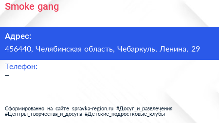 Smoke gang по адресу 456440, Челябинская область, Чебаркуль, Ленина, 29 в дальнейшем Организация, размещена в следующих категориях: