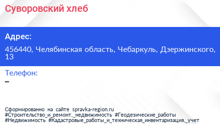 Суворовский хлеб по адресу 456440, Челябинская область, Чебаркуль, Дзержинского, 13 в дальнейшем Организация, размещена в следующих категориях: