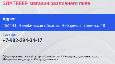 ЗЛАТBEER, магазин разливного пива по адресу 456441, Челябинская область, Чебаркуль, Ленина, 48 в дальнейшем Организация, размещена в следующих категориях: