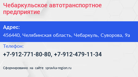 Чебаркульское автотранспортное предприятие по адресу 456440, Челябинская область, Чебаркуль, Суворова, 9а в дальнейшем Организация, размещена в следующих категориях: