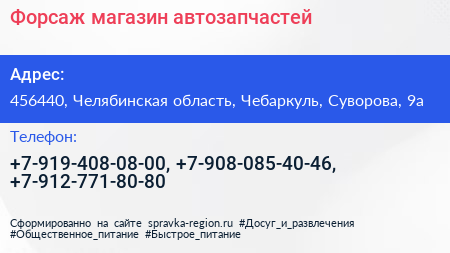 Форсаж, магазин автозапчастей по адресу 456440, Челябинская область, Чебаркуль, Суворова, 9а в дальнейшем Организация, размещена в следующих категориях: