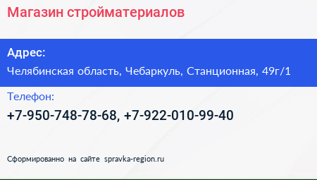 Магазин стройматериалов по адресу Челябинская область, Чебаркуль, Станционная, 49г/1 в дальнейшем Организация, размещена в следующих категориях:
