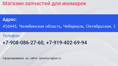 Магазин запчастей для иномарок по адресу 456441, Челябинская область, Чебаркуль, Октябрьская, 1 в дальнейшем Организация, размещена в следующих категориях: