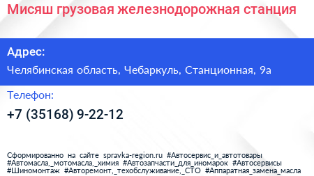 Мисяш, грузовая железнодорожная станция по адресу Челябинская область, Чебаркуль, Станционная, 9а в дальнейшем Организация, размещена в следующих категориях: