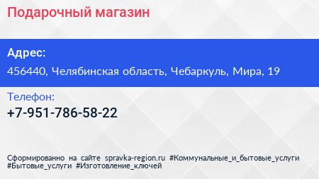 Подарочный, магазин по адресу 456440, Челябинская область, Чебаркуль, Мира, 19 в дальнейшем Организация, размещена в следующих категориях: