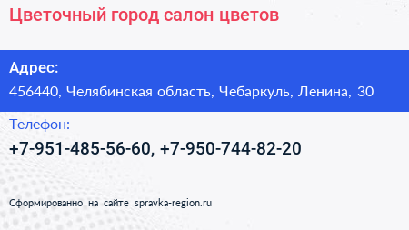 Цветочный город, салон цветов по адресу 456440, Челябинская область, Чебаркуль, Ленина, 30 в дальнейшем Организация, размещена в следующих категориях: