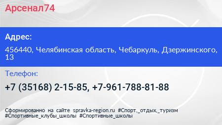 Арсенал74 по адресу 456440, Челябинская область, Чебаркуль, Дзержинского, 13 в дальнейшем Организация, размещена в следующих категориях: