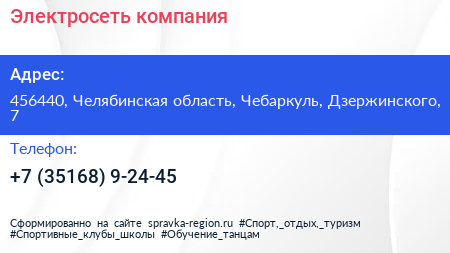 Электросеть, компания по адресу 456440, Челябинская область, Чебаркуль, Дзержинского, 7 в дальнейшем Организация, размещена в следующих категориях: