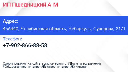 ИП Пшедницкий А.М. по адресу 456440, Челябинская область, Чебаркуль, Суворова, 21/1 в дальнейшем Организация, размещена в следующих категориях: