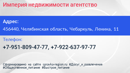 Империя недвижимости, агентство по адресу 456440, Челябинская область, Чебаркуль, Ленина, 11 в дальнейшем Организация, размещена в следующих категориях: