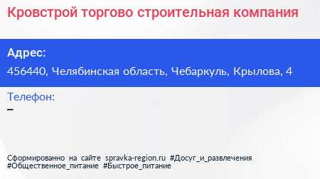 Кровстрой, торгово-строительная компания по адресу 456440, Челябинская область, Чебаркуль, Крылова, 4 в дальнейшем Организация, размещена в следующих категориях: