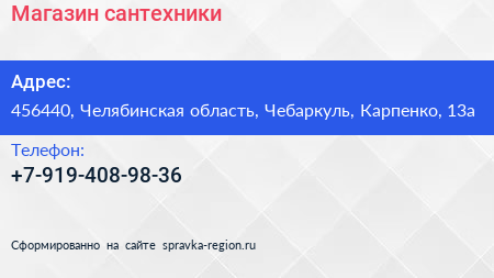 Магазин сантехники по адресу 456440, Челябинская область, Чебаркуль, Карпенко, 13а в дальнейшем Организация, размещена в следующих категориях: