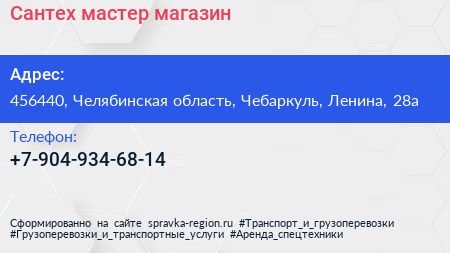 Сантех-мастер, магазин по адресу 456440, Челябинская область, Чебаркуль, Ленина, 28а в дальнейшем Организация, размещена в следующих категориях: