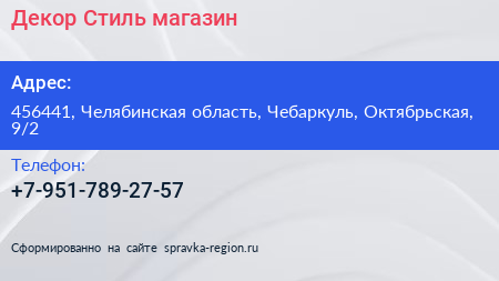 Декор-Стиль, магазин по адресу 456441, Челябинская область, Чебаркуль, Октябрьская, 9/2 в дальнейшем Организация, размещена в следующих категориях: