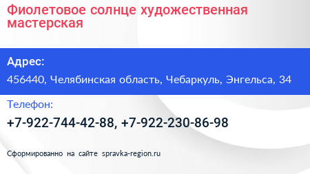 Фиолетовое солнце, художественная мастерская по адресу 456440, Челябинская область, Чебаркуль, Энгельса, 34 в дальнейшем Организация, размещена в следующих категориях: