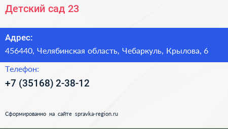 Детский сад №23 по адресу 456440, Челябинская область, Чебаркуль, Крылова, 6 в дальнейшем Организация, размещена в следующих категориях: