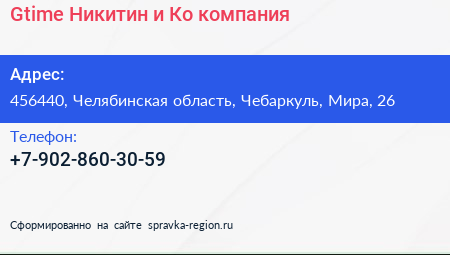 Gtime: Никитин и Ко, компания по адресу 456440, Челябинская область, Чебаркуль, Мира, 26 в дальнейшем Организация, размещена в следующих категориях: