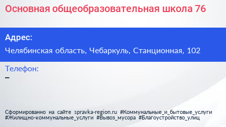 Основная общеобразовательная школа №76 по адресу Челябинская область, Чебаркуль, Станционная, 102 в дальнейшем Организация, размещена в следующих категориях: