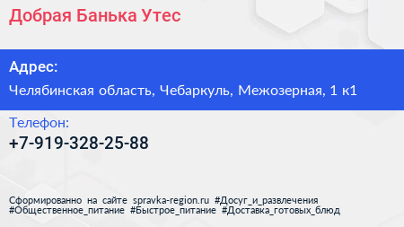 Добрая Банька Утес по адресу Челябинская область, Чебаркуль, Межозерная, 1 к1 в дальнейшем Организация, размещена в следующих категориях: