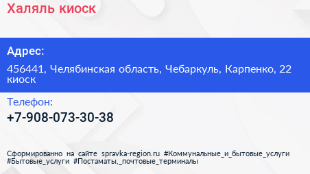 Халяль, киоск по адресу 456441, Челябинская область, Чебаркуль, Карпенко, 22 киоск в дальнейшем Организация, размещена в следующих категориях: