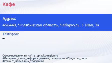 Кафе по адресу 456440, Челябинская область, Чебаркуль, 1 Мая, 3а в дальнейшем Организация, размещена в следующих категориях: