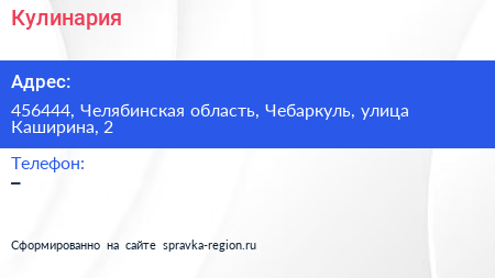 Кулинария по адресу 456444, Челябинская область, Чебаркуль, улица Каширина, 2 в дальнейшем Организация, размещена в следующих категориях: