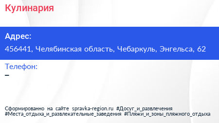 Кулинария по адресу 456441, Челябинская область, Чебаркуль, Энгельса, 62 в дальнейшем Организация, размещена в следующих категориях: