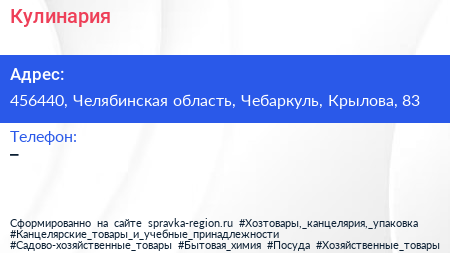 Кулинария по адресу 456440, Челябинская область, Чебаркуль, Крылова, 83 в дальнейшем Организация, размещена в следующих категориях: