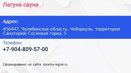 Лагуна, сауна по адресу 456447, Челябинская область, Чебаркуль, территория Санаторий Сосновая горка, 5 в дальнейшем Организация, размещена в следующих категориях: