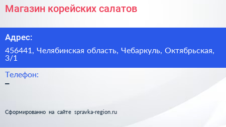 Магазин корейских салатов по адресу 456441, Челябинская область, Чебаркуль, Октябрьская, 3/1 в дальнейшем Организация, размещена в следующих категориях: