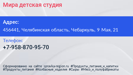 Мира, детская студия по адресу 456441, Челябинская область, Чебаркуль, 9 Мая, 21 в дальнейшем Организация, размещена в следующих категориях: