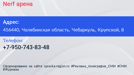 Nerf-арена по адресу 456440, Челябинская область, Чебаркуль, Крупской, 8 в дальнейшем Организация, размещена в следующих категориях:
