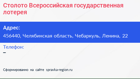 Столото, Всероссийская государственная лотерея по адресу 456440, Челябинская область, Чебаркуль, Ленина, 22 в дальнейшем Организация, размещена в следующих категориях: