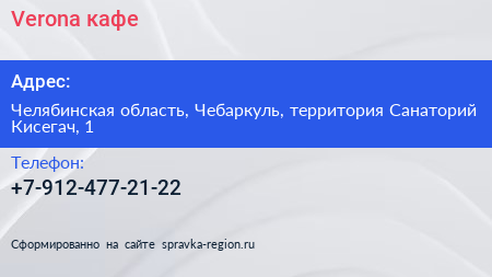 Verona, кафе по адресу Челябинская область, Чебаркуль, территория Санаторий Кисегач, 1 в дальнейшем Организация, размещена в следующих категориях: