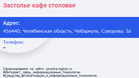 Застолье, кафе-столовая по адресу 456440, Челябинская область, Чебаркуль, Суворова, 3а в дальнейшем Организация, размещена в следующих категориях: