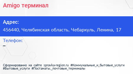 Amigo, терминал по адресу 456440, Челябинская область, Чебаркуль, Ленина, 17 в дальнейшем Организация, размещена в следующих категориях: