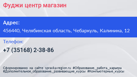 Фуджи-центр, магазин по адресу 456440, Челябинская область, Чебаркуль, Калинина, 12 в дальнейшем Организация, размещена в следующих категориях: