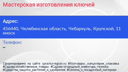 Мастерская изготовления ключей по адресу 456440, Челябинская область, Чебаркуль, Крупской, 11 киоск в дальнейшем Организация, размещена в следующих категориях: