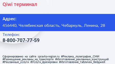 Qiwi, терминал по адресу 456440, Челябинская область, Чебаркуль, Ленина, 28 в дальнейшем Организация, размещена в следующих категориях: