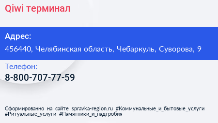 Qiwi, терминал по адресу 456440, Челябинская область, Чебаркуль, Суворова, 9 в дальнейшем Организация, размещена в следующих категориях:
