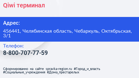 Qiwi, терминал по адресу 456441, Челябинская область, Чебаркуль, Октябрьская, 3/1 в дальнейшем Организация, размещена в следующих категориях: