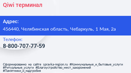 Qiwi, терминал по адресу 456440, Челябинская область, Чебаркуль, 1 Мая, 2а в дальнейшем Организация, размещена в следующих категориях: