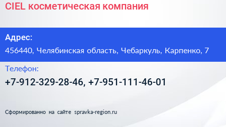CIEL, косметическая компания по адресу 456440, Челябинская область, Чебаркуль, Карпенко, 7 в дальнейшем Организация, размещена в следующих категориях: