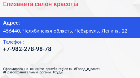 Елизавета, салон красоты по адресу 456440, Челябинская область, Чебаркуль, Ленина, 22 в дальнейшем Организация, размещена в следующих категориях: