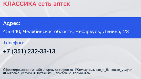 КЛАССИКА, сеть аптек по адресу 456440, Челябинская область, Чебаркуль, Ленина, 23 в дальнейшем Организация, размещена в следующих категориях: