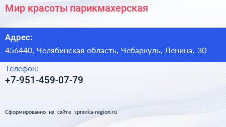 Мир красоты, парикмахерская по адресу 456440, Челябинская область, Чебаркуль, Ленина, 30 в дальнейшем Организация, размещена в следующих категориях:
