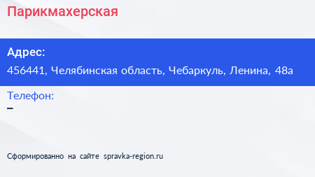 Парикмахерская по адресу 456441, Челябинская область, Чебаркуль, Ленина, 48а в дальнейшем Организация, размещена в следующих категориях: