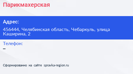 Парикмахерская по адресу 456444, Челябинская область, Чебаркуль, улица Каширина, 2 в дальнейшем Организация, размещена в следующих категориях: