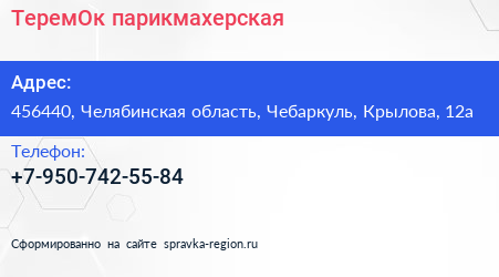 ТеремОк, парикмахерская по адресу 456440, Челябинская область, Чебаркуль, Крылова, 12а в дальнейшем Организация, размещена в следующих категориях: