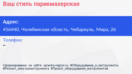 Ваш стиль, парикмахерская по адресу 456440, Челябинская область, Чебаркуль, Мира, 26 в дальнейшем Организация, размещена в следующих категориях: